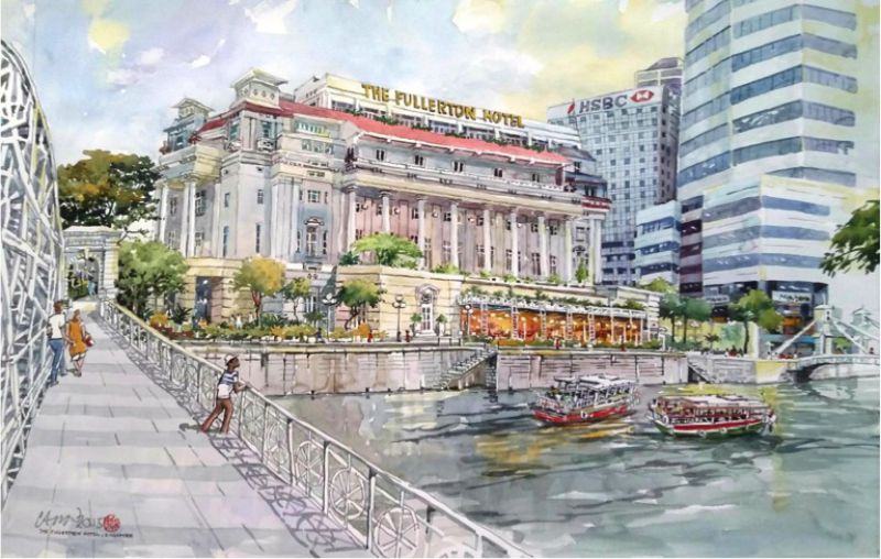 The historically-rich Fullerton Hotel is captured in this painting in Chin Chun Wah's signature style, done using a mixture of marker pens and watercolour. Formally called the Fullerton Building, it was previously home to the General Post Office and was even used as a hospital as well as the headquarters of the Japanese military administration in Singapore, during World War II. It was finally converted to a hotel in 1997, when a developer bought over the building and begin renovations. The Fullerton Hotel officially opened on 1 January 2001.
