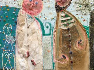 In this work by Eva Armisen, a mother embraces her two children as she reads them a storybook. The charming floral motifs in the background of the work evoke a sense of vibrancy, that is reinforced by the movement created by the sweeping pattern of the mother’s hair. The feeling of joy evident in this scene is reflected in the sweet smiles on the faces of all the individuals and their rosy blush, highlighting their sense of contentment. Through her signature child-like style, Armisen creates a heartwarming depiction of togetherness and familial love, and illustrates the joy that can be found in such simple moments in everyday life.