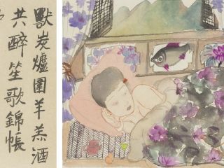 Li Jin is recognised for his unconventional art, which blends classical Chinese brushwork with depictions of mundane, bodily or private moments. His pieces, executed with fluid, watery lines and vibrant colours, frequently feature figures with less-than-perfect physiques, shown engaging in solitary or self-indulgent actions such as eating, drinking, bathing or just relaxing. The men and women in Li Jin’s drawings appear relaxed and comfortable in their bodies oblivious of their imperfections. There is also something disarming and innocent about the way he portrays them realistically – their breasts and tummies have little rolls of fat spilling over their underwear. They remain individuals with none of the usual ideals of how society thinks they should look.