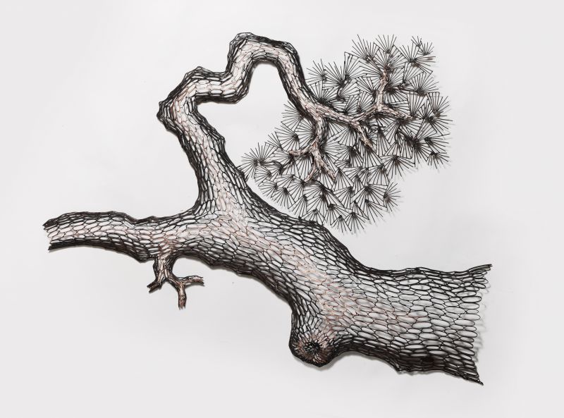 In his persistent need to create organic forms Lee Gil-Rae takes it one step further in creating man-made nature. His works consist of surreal, leafless forests that one can meander into, with spiralling branches that are unnatural in structure but organic in aesthetic. These draw the viewer in to witness the intricate exteriors that mimic the curves and notches of aged tree bark. His sprawling branches fan out and are tipped with wisps of copper representing the needles of the pine trees, in true homage to Mother Nature.