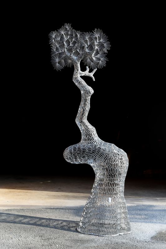 In his persistent need to create organic forms Lee Gil-Rae takes it one step further in creating man-made nature. His works consist of surreal, leafless forests that one can meander into, with spiralling branches that are unnatural in structure but organic in aesthetic. These draw the viewer in to witness the intricate exteriors that mimic the curves and notches of aged tree bark. His sprawling branches fan out and are tipped with wisps of copper representing the needles of the pine trees, in true homage to Mother Nature.