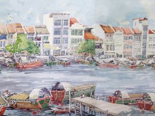 In this painting, Chin Chun Wah depicts the back lane of a row of shophouses, most likely those along the Singapore River. Done in the artist's signature style, using a mixture of watercolour and marker pens, this painting shows a side of Singapore that people might not get to see.
