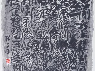 Using large, expressionist and cursive strokes, Lim Tze Peng inscribes the Tang Dynasty poem《出塞 》Beyond the Border by 王之涣 Wang Zhi Huan. This piece marks one of Lim’s latest works as he continues to experiment and explore the creative potential of calligraphy using vivid colours. Lim’s selective use of yellow and blue is akin to water flowing along the Yellow River and mountainous outlines on the sky as described in the verse. The bright and energetic colours accentuate the unique shape of the Chinese characters that form Lim’s signature breakthrough style 糊涂字 hutuzi , which in this piece emphasises on its aesthetic appeal rather than legibility. Yet the background also creates a striking contrast that draws attention away from the text and semantics. Lim therefore invites us to focus on the artistic expression of his work and its compositional structure. The final result is an abstract artwork and cohesive image whereby the amalgamation of painting and calligraphy is apparent. The poem《出塞》 reads:黄河远上白云间, 一片孤城万仞山, 羌笛何须怨杨柳, 春风不度玉关门。Wang reveals his sense of isolation and loneliness as he hears a familiar melody played on a bamboo flute, reminding him of his hometown.