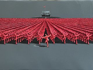 Yu Nancheng captures the iconic Tiananmen Square, where multiple figures engage in Tai Chi, blending rhythmic grace with the city's vibrant energy. A central figure, rendered with sculptural impasto, moves through a formation of other Tai Chi practitioners in blue-green, against a striking red backdrop, echoing the square's iconic architecture. The dynamic composition, with its bold colours and strong perspective, symbolizes the resilience of the Chinese spirit in overcoming life's challenges.