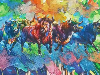 This painting explodes with the raw potential of a bull in motion. It's not a static portrait, but a glimpse of untamed energy, poised between a kick and a charge. The bull is a force of nature, ready to unleash its power. Feel the energy and connect with the primal power of this magnificent creature!