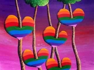 "Appreciation of Nature by Youth," whispers of sweet moments found in the heart of nature. Imagine a twilight painted in hues of fiery orange melting into a deep, dreamy blue, where a whimsical tree blossoms with a rainbow of floral affection. Two figures nestled at its base seem lost in gentle companionship, perhaps sharing quiet whispers as a third serenades them from above. A heart, ripe and red, dangles playfully, a symbol of the tender connection blossoming in this enchanting scene. It's a moment suspended in time, filled with the simple yet profound romance of shared appreciation for the beauty around them.