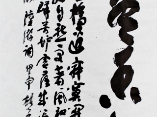 空山新雨后,天气晚来秋。 明月松间照,清泉石上流。 竹喧归浣女,莲动下渔舟。 随意春芳歇,王孙自可留。 Lim Tze Peng writes the characters from the poem 竹里馆 or The Bamboo Lodge by Wang Wei (699-759) - a famous Tang Dynasty poet, musician, painter and official. The entire poem reads: 独坐幽篁里, 弹琴复长啸;深林人不知, 明月来相照. It translates to: Seated alone in the remote bamboo grove, I strum the lute and sing aloud. Deep in the woods, no one knows I exist, only the bright moon shines it's light upon me. Wang Wei was one of the most famous poets of the Tang Dynasty. His writings speak of a meditative experience amidst tranquil scenery. Lim Tze Peng breathes life into the words with spirited strokes of ink.