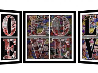 Patrick Rubinstein's "petit bisou" presents a playful exploration of pop culture icons and the word "LOVE." The first two panels feature Mickey and Minnie Mouse in contrasting color schemes, suggesting a dynamic relationship. The latter two panels burst with the word "LOVE!" in a comic book style, rendered against a vibrant collage of cartoonish figures and a bold yellow background. This juxtaposition of iconic characters with the direct expression of "LOVE" creates a sense of playful energy. The lenticular effect, implied by Rubinstein's style, likely adds a shifting, dynamic quality to the imagery. The work captures the essence of love as a vibrant, dynamic, and ever-present force, filtered through the lens of pop culture.