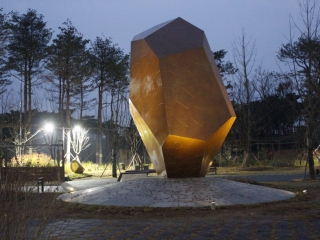 Choi Tae-hoon's work is unexcelled in its scale and its production method in difficulty. His work, product of steel welding, is also about a race against time. It's simply because it's a time-consuming project. His studio in Icheon, Gyeonggi, filled with sharp noises from steel grinder in good harmony with devouring flames and dull deafening roar, reminds one of a gigantic ironworks. Piled steel sheets in every nook and corner, and scattered finished works in his spacious studio emit a breath of Sculptor, Choi Tae-hoon. His favorite cutting technique is plasma torching technique. This steel cutting technique, using compressed air, ultimately makes minute holes in the steel plate. In other words, by applying countless scratches on a steel surface, it produces granular surface texture like the skin of an old elephant or harrowed paddy field.