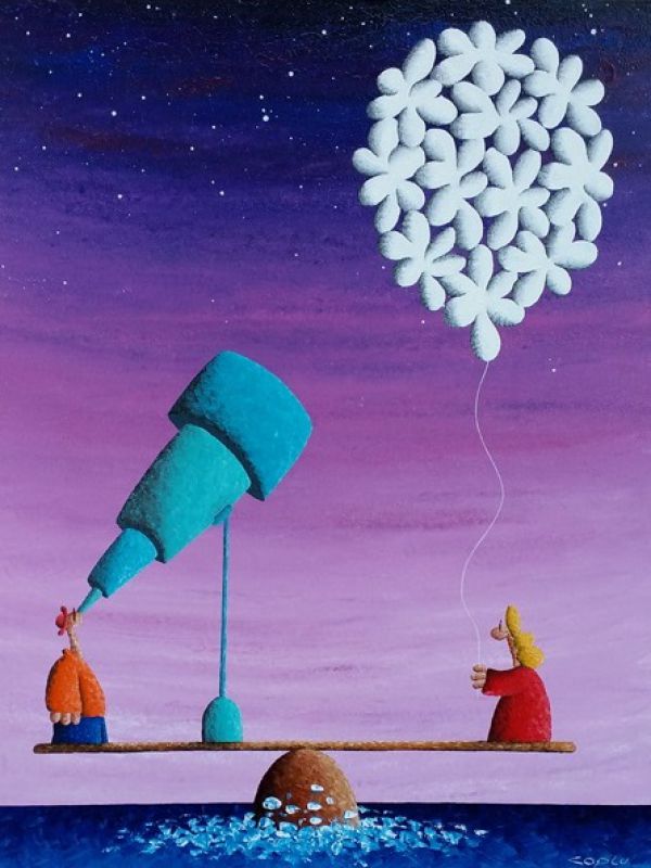 Born in the Turkish town of Ushak, Coplu brought into the art world his distinctive style of cartoons, filled with warm and sentimental characters that range from silly to profound. Highly recognized and exhibited, the artist has won many competitions and accolades for his artworks and has been published in various media in Turkey, South East Asia and across Europe. He has also established an Open Air Cartoon Exhibition Space and the Cartoon School of Antalya. Part of many prestigious collections, the artist has been exhibited the world over, including France, Italy, the US, Germany and Spain.