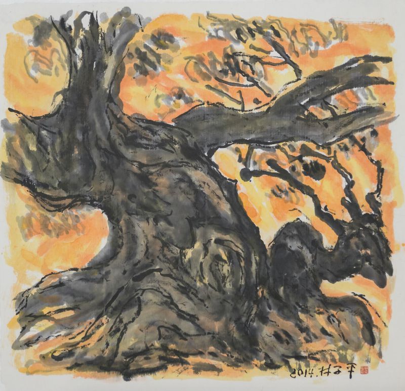 "To me, a life without art is like a tree without roots." - Lim Tze Peng. Trees, symbolizing vitality and strength, are a recurring theme in Lim's work. He emphasizes rootedness, believing it essential for personal grounding. In this painting, he uses bold, pigmented calligraphic strokes to define a majestic tree's silhouette, playing with ink densities to create depth. This technique allows viewers to appreciate the tree’s grandeur, with branches reaching upward from strong roots. The lighter background, with streaks of warm orange and yellow, enhances the tree's vibrancy and spontaneity, bringing it to life.