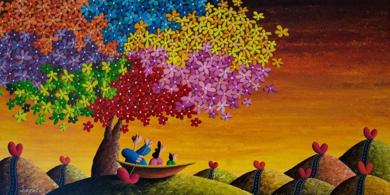 Under a large tree embellished with vibrant and bright multicoloured flowers, a family is seen on a boat looking at the sunset. Resting atop a mountain, the father anchors the heart-shaped paddle to keep the family steady. Looking at the mountains ahead of them, the family looks forward - confident in their ability to reach new heights. Through this piece, Coplu illustrates the power and strength of love between the family members in conquering the mountains faced throughout one’s life.