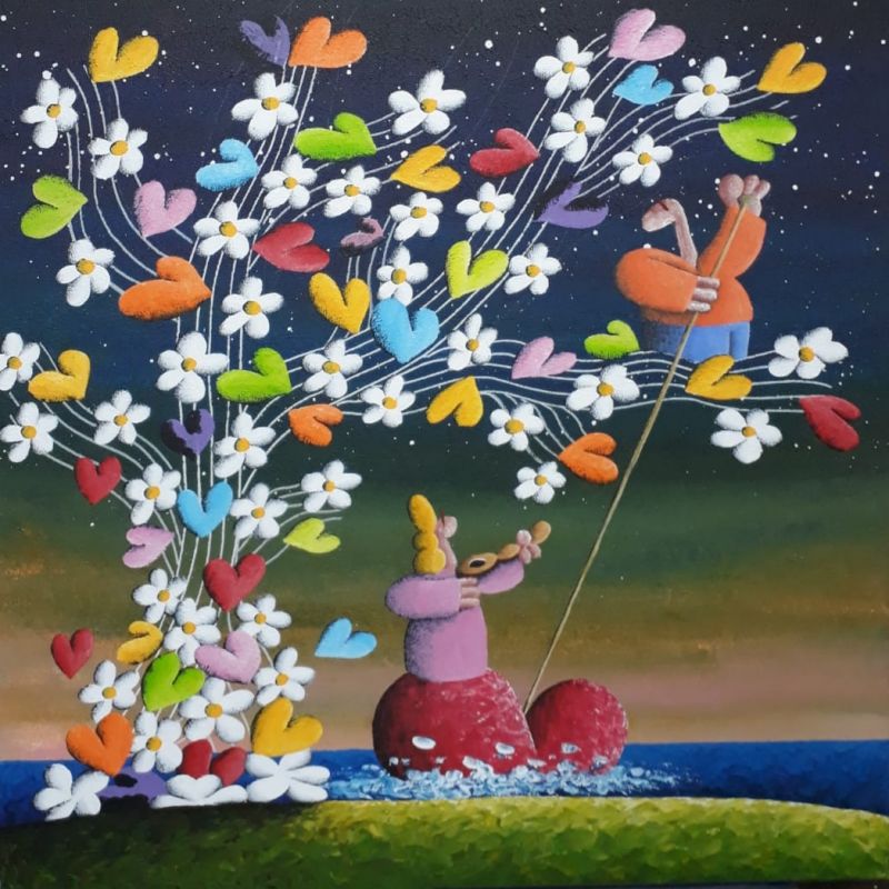 In this painting, Coplu paints a stunning representation of the power of love and nature. With his vibrant colours, simple yet ingenious composition and heartwarming imagery, he paints an image of two lovers, separated physically but emotionally intimate. The woman sits on a heart, reminiscent of a boat, playing an instrument while the man, perched on a tree made of musical lines, colourful hearts and flowers, uses an oar to anchor her. The stunning evening skyline becomes the perfect background for the pair of romantic lovers.