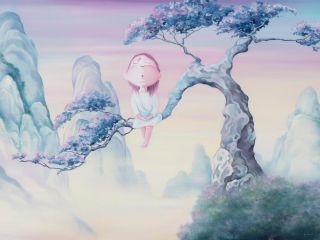 Wu Qiong’s ‘Little Dragon’s Conjecture’ portrays the main character donning a sweet playful dinosaur tee and with a pink dragon enveloping them. This speaks to Wu Qiong’s signature style of representing characters coming to terms with the world of adulthood, but still remaining distinctly childlike; a suggestion that part of us never truly lets go of childhood. This painting signifies the power of imagination and as the character has their eyes closed, their imagination comes alive.