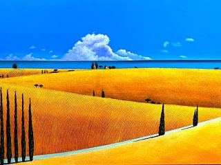 Ronnie Ford’s “Tree for the First Born" depicts the Swiss countryside with the Alps in the background and a solitary tree in the foreground. The tree represents the Swiss tradition of planting one to honor a firstborn child, symbolizing growth and strength. The painting blends nature’s beauty with the symbolic connection between life and the land, capturing both the serenity of the landscape and the significance of this tradition.