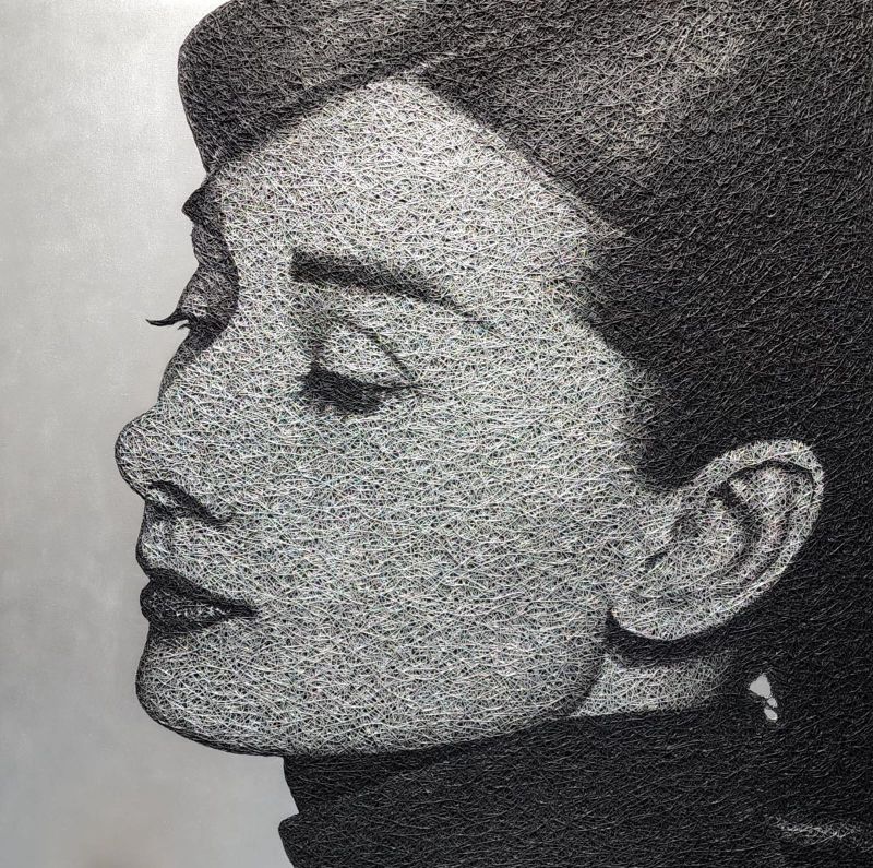 This artwork by Chansrinual portrays Audrey Hepburn in an elegant side profile, rendered with his distinctive technique of layered, interwoven lines that create both texture and depth. At first glance, the portrait appears photorealistic, but upon closer inspection, the surface reveals a complex network of fine, overlapping strokes that form a delicate mesh. This intricate web of lines conveys both fragility and strength, echoing Hepburn’s timeless grace and inner resilience. The technique emphasizes contrasts—light and shadow, softness and precision—capturing not only her iconic beauty but also a sense of serenity, introspection, and quiet dignity.