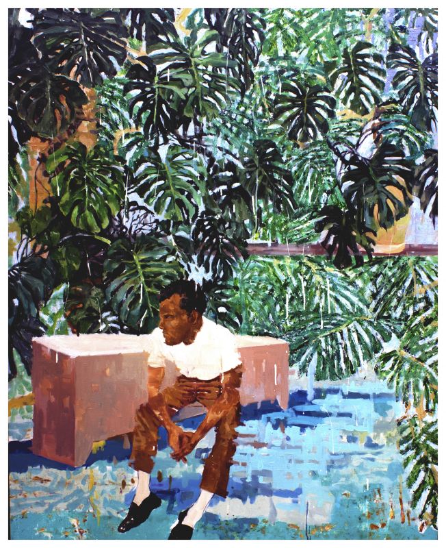 In Moment, the figure sits quietly within a dense interior of tropical foliage, suspended between presence and withdrawal. The surrounding leaves—rendered in layered, expressive brushstrokes—envelop the seated subject in a living architecture of green. Nature does not merely frame the figure; it presses inward, asserting both intimacy and quiet tension.