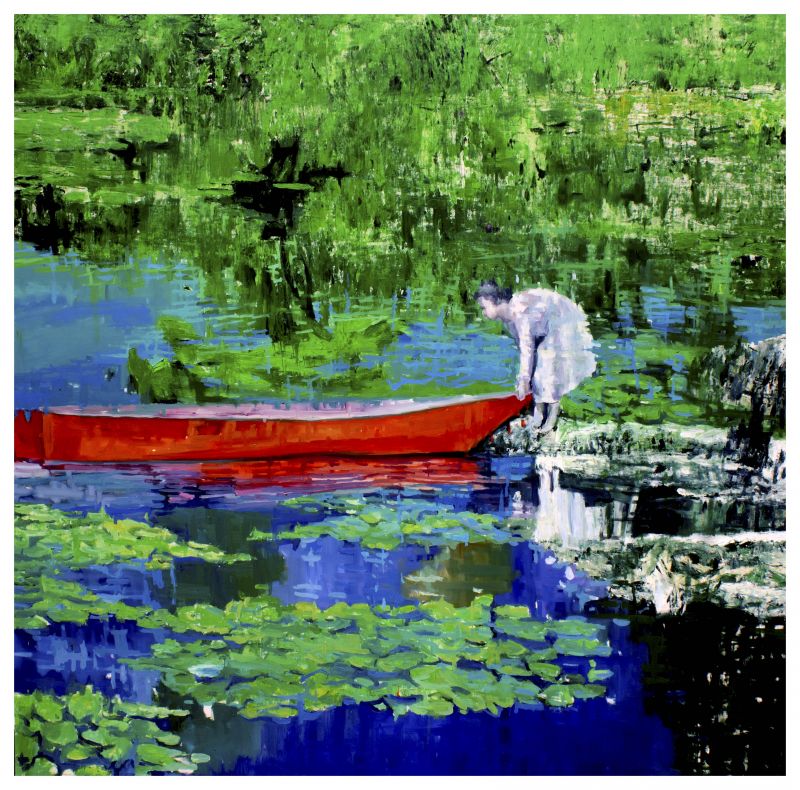 Here, beauty is neither grand nor distant—it is found in fleeting gestures, in moments of transition. The pond, thick with floating vegetation, becomes a mirror of contemplation. The bold red of the boat introduces a pulse of urgency within an otherwise tranquil scene, suggesting that within stillness lies the possibility of movement.