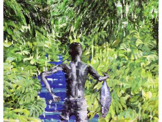 Unlike the softer serenity of earlier works, “Posthuman Scape” introduces tension. The human form appears small, nearly swallowed by vegetal excess and expressive abstraction. The added streaks disrupt illusionistic space, pulling us back into the materiality of paint itself.