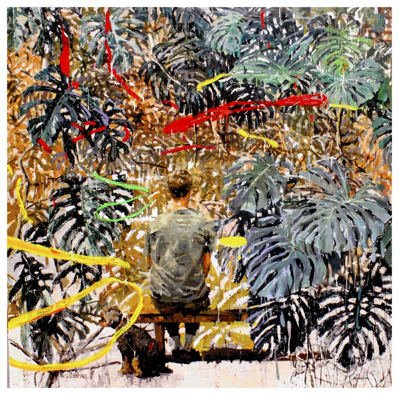 In this large-scale composition, a seated figure faces an overwhelming terrain of foliage, interrupted by gestural streaks of red and yellow paint. The surface feels layered, almost restless — controlled chaos unfolding across the canvas.