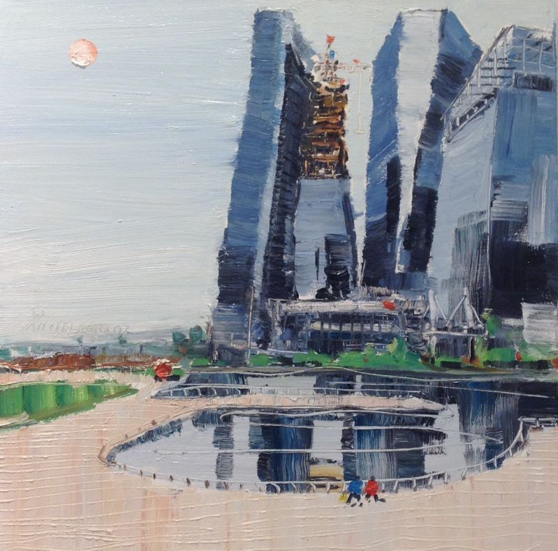 Towering pillars of metal and glass, the Financial Centre, Marina Bay, is an arching display of modern aesthetics and a city hub for work and play alike. Having a keen architectural eye, by virtue of his past, Zhu Hong recreates the impressive spires in his own signature stylings. Once again, using a flow of obscure wipes and scrutinized detailing, the artist creates a yawning overall cityscape, but holds firmly with roots of fine texturing and structured components. Hong's contrast of wide spacing and subtle detailing are common features of his art that show case not only the dexterity and skill involved in his creations, but the shifting perspectives that can both encapsulate and refresh attuned visuals.