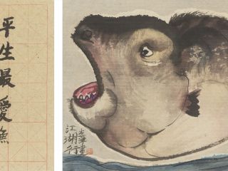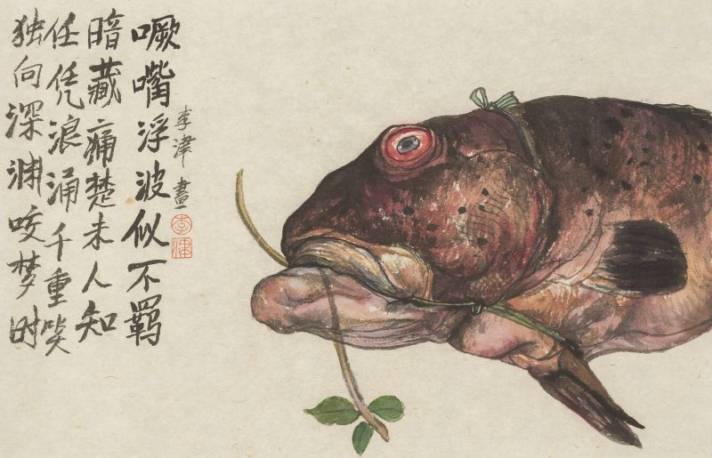 噘嘴鱼 is exemplary of Li Jin’s practice, rooted in the immediacy of everyday life. During his residency across Southeast Asia, he wandered through markets, documenting the abundance of tropical produce, tasting street food and local cuisine. Rendered with remarkable specificity, each fish is depicted in close detail—its weight, texture, and presence carefully observed. The washes of ink and colour remain fluid and responsive, allowing scales, fins and flesh to emerge. Li Jin’s approach is neither idealised nor symbolic. Instead, the fish appear as they are: slightly ungainly, fleshy and real. Their expressions—wide-eyed, slack-jawed, or taut with tension—suggest moments suspended between movement and stillness. The compositions are intimate and direct, often isolating the fish against open space, drawing attention to form, gesture and texture. The accompanying calligraphy is executed with confident, rhythmic strokes, the text introduces a measured cadence that balances the physical immediacy of the fish.